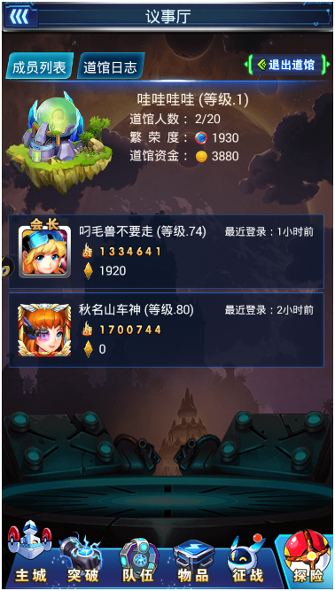 议事厅:显示道馆信息、成员列表、道馆日志的地方。道馆信息里有道馆的等级、人数、繁荣度和道馆资金。其中繁荣度和道馆资金是用于提升道馆等级的重要条件。下方还可查看成员最近的登录时间,方便会长进行人员管理。成员若要退出,点击右上角的“退出道馆”即可。