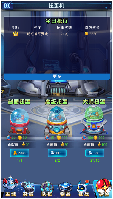 扭蛋机;可以分别用金币、钻石来购买扭蛋为道馆提高资金和繁荣度,还可获得个人贡献值。