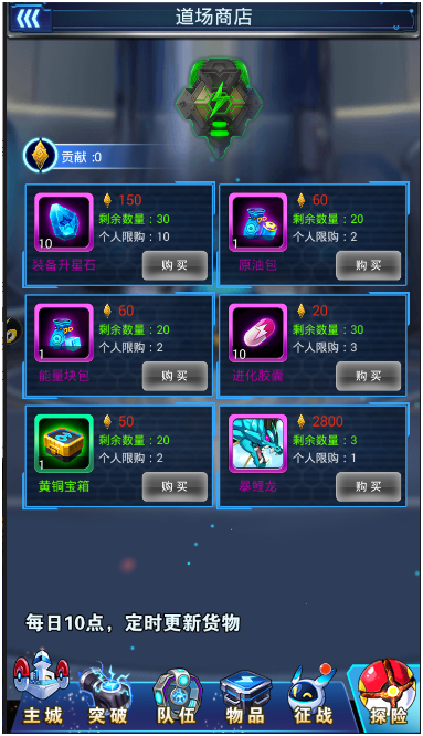 道馆商店:每日10点,定时更新货物。出售各类宝箱、稀有资源包及紫色精灵等,用个人所获得的贡献值可购买。