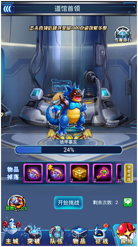 道馆副本:道馆等级到达2级时可开放道馆副本。刷爆资源靠的就是团队合作,成员齐心协力击杀道馆BOSS,必会获得紫装、紫装碎片、灵金宝箱、灵金钥匙中随机分配的物品,未击杀完成将无法获取噢。点击左下角的鼓舞,消耗50钻石可以增加1次5%的伤害,增加2次就是10%,增加3次就是15%等。伤害提升是击杀BOSS的利器。每关挑战成功还将增加1000点的公会繁荣度。