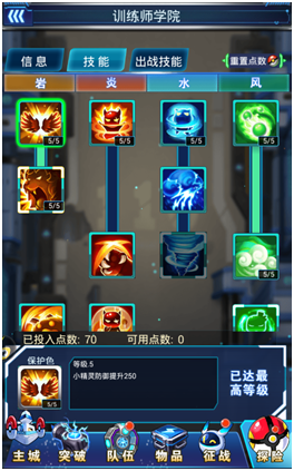 《宠物大乱斗》主城中,有三个最重要的系统,就是研究所、精灵中心和训练师学院。英雄到达12级将会开启研究所系统,只有当研究所系统提升到一定等级后,才可对精灵中心系统和训练师学院系统升级。而精灵中心系统的等级,决定了精灵的上阵数量,只有等级越高,携带上阵和助阵的精灵才越多,这是至关重要的环节。而训练师学院呢,是训练师和精灵学习技能的唯一途径。里面包含了岩、炎、水、风四种属性的魔法技能。杀伤力也是不可估量的噢。目前游戏改版后,助战位置由原有的最大8个格子提升为10个,绝不落下一个小伙伴哒。