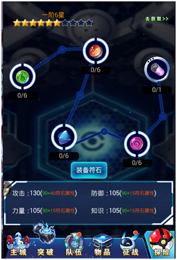 此外,每位主角玩家也有自己的突破功能。在探险挂机中,会得到大量的锻造材料,这些材料可在铁匠铺里锻造成突破所需的符文。每种符文分别代表知识、攻击、力量、防御等属性。训练师佩戴不同符文会增加其自身的属性,当集齐一定数量的符文,就可进行训练师属性突破。