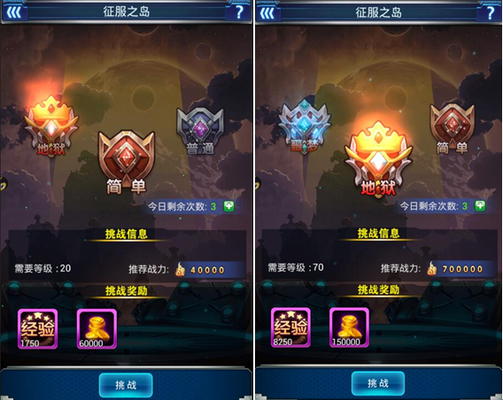 征战系统是各项副本挑战的集合地,共由五大副本构成。本页主要介绍征服之岛系统。 副本名称:征服之岛 挑战难度:分为简单、普通、困难、英雄、噩梦、地狱这六个不同难度的关卡。 挑战条件:训练师到达20级可开启副本,每十级解锁一个新难度。 挑战次数:每周二、周五、周日开放,每天可挑战2次 挑战奖励:挑战成功会获得大量的经验和金币。