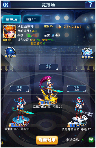 小编今天和大家讲一讲《宠物大乱斗》中,竞技场的基本功能 玩家进入竞技场后,通过挑战对手进行战斗,战斗胜利会提高排名。可免费刷新对手。每次战斗胜利额外获得50点荣誉,失败不获得。 每日可战斗5次,还可以购买额外次数。可额外购买的总次数与VIP等级挂钩,具体数据在VIP功能中详细说明。战斗次数凌晨5点重置。