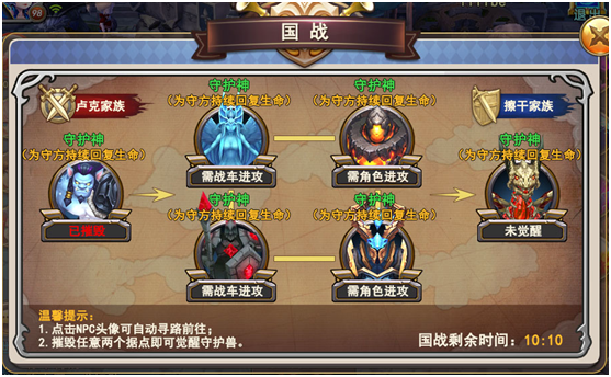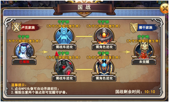 b)摧毁据点:守方主城有4个据点,需要摧毁4座据点中的任意两个,可激活守护兽并进入到下一个阶段;