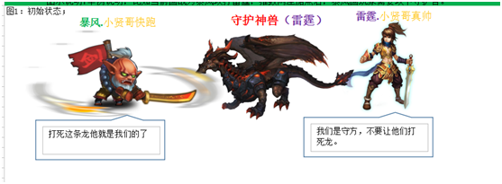 d)守护兽争夺战:进攻方占领守护兽后,进入守护兽抢夺阶段,通过击杀守护兽进行抢夺,最后活动结束时,守护兽当前归属的一方可获得国战胜利,规则图示如下: