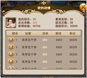 1.系统根据玩家在国战中获得的积分进行排行,根据排行结果,在国战结束时,向所有成员发放礼包。