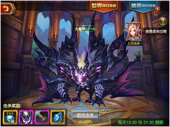 1.开启时间:每天15:00以及每天的21:00刷新boss。