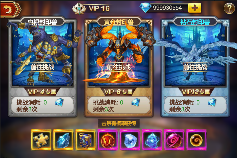 1.VIP BOSS副本在角色达到相应VIP等级和职业等级之后开放,其中VIP4~7可以挑战白银BOSS,VIP8~11可以挑战黄金BOSS,VIP12~16可以挑战钻石BOSS;