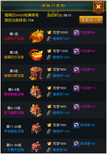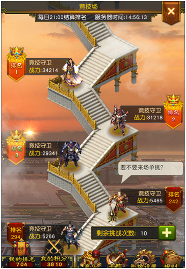 挑战排名比自己高的玩家,获胜不仅可以取代他的位置,更能获得竞技积分和声望等奖励。每日21点,系统会根据当时的名次发放排名奖励。而每周日24点,系统会根据玩家这一周所累积的积分排名,来给予玩家更加丰厚的奖励。