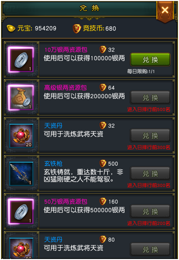 每场竞技战斗结束后,玩家都能获得一定数量的竞技币,竞技币可以在竞技商店中兑换许多有用的物品,其中最诱人的莫过于神兵部件了。但是仅仅拥有竞技币是不行的,有些物品还对玩家的竞技场排名有所要求。努力提升自己的实力,爬上更高的位置,将是所有人的追求。