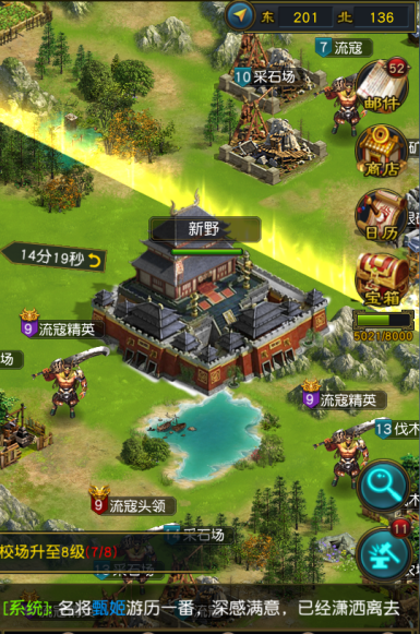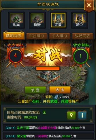 地图上总共有四座城池可供军团攻打,分别为乌巢(盛产粮草)、新野(盛产木材)、汉中(盛产石料)、江夏(盛产铁矿),每轮活动只开放其中的两座城池参与争夺战。