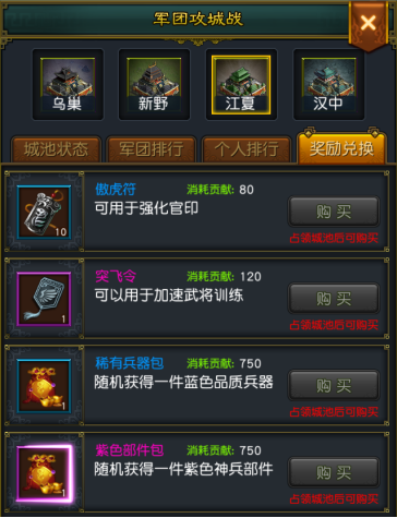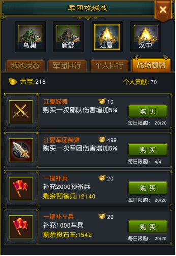 系统还贴心的为各位玩家准备了战场商店,只有在攻城战开始时才会开放。如果觉得攻城有困难,可以直接在战场商店中购买各种BUFF以及一键补兵。