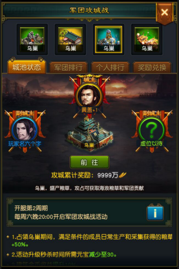每座城池都会有一位名将驻守,只有所有人齐心合力将其击败才能进行城池争夺。对名将进行最后一击的军团享有该城池的所有权,其他军团只有将此军团的驻守军队全部打败后才能抢夺到该座城池的所有权。若在活动开启前,已经有军团占领该次开放的城池,需要先将该军团的驻守部队全部打败后才能继续对战驻守将领。
