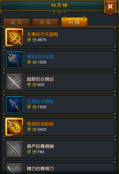 系统入口:主城内铁匠铺 或 主界面—武将—兵器图标