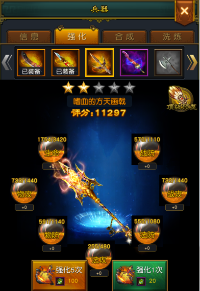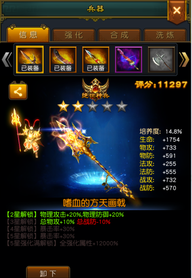 兵器的属性数值并不是一成不变,通过强化可让自己手中的兵器更上一层楼。兵器属性数值强化至满便可进行兵器升星,升星可以解锁兵器的星级属性,使兵器更上一层楼。越高品质的兵器,每个星级属性上限越高。