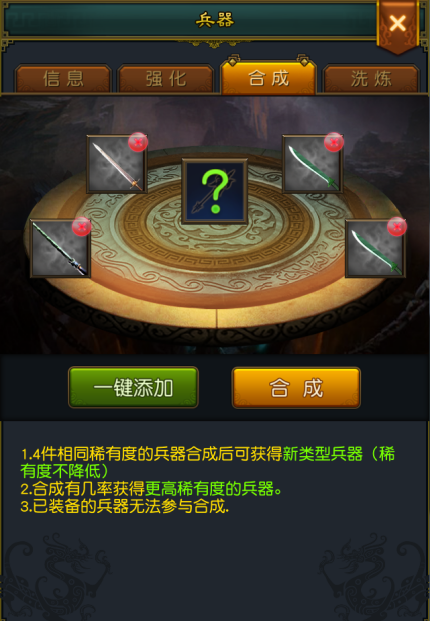 兵器太多,占用背包?没关系,兵器合成来为你排忧解难。4件相同稀有度的兵器即可合成一件新类型的兵器,如果运气好,甚至有可能得到一件更高稀有度的兵器哦。