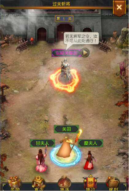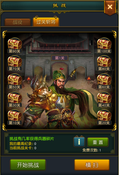 1. 过关斩将总共有100关,每关都会有一个守关将阻碍关公的去路,点击守将即可进入备战界面,战胜此人才能继续通关。