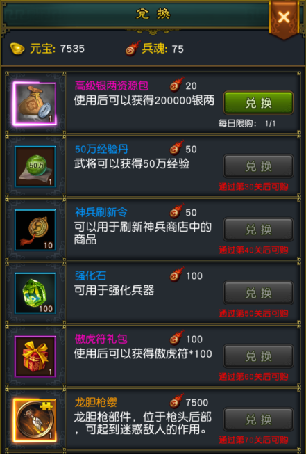 2. 每种可兑换的道具都有通关数的要求,只有通过相应的关隘才能开启该道具的兑换。