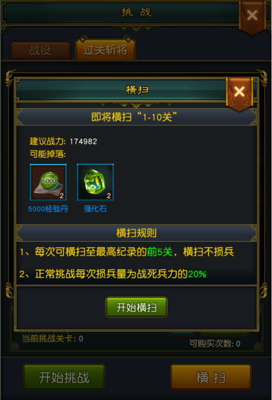 1. 对于玩家已经通关的关卡,不需要再次进入关隘手动挑战,使用“横扫”便可进行自动通关。