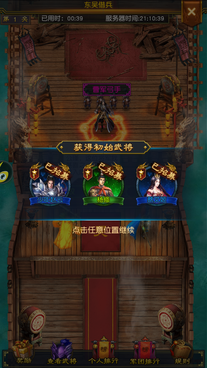 1、东吴借兵总共有30关,每关都会有一个守将,点击守将即可进入备战界面,战胜守军便可获得将领或者神兵,并开启下一个关卡。