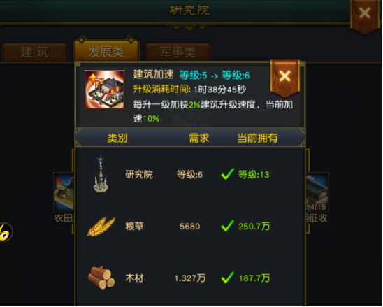 打个比方,特权二包建筑升级最后10分钟,升级某个建筑原本需要1小时,那么你需要10张五分钟建筑加速才能立即升级完毕。而开服当天晚上大家普遍能升到7级城,建筑加速科技可以到6级,这就能提升12%的速度,那么原本1小时现在只需要53分钟,我们如果想立即完成,只需要8张五分钟建筑加速再等3分钟。