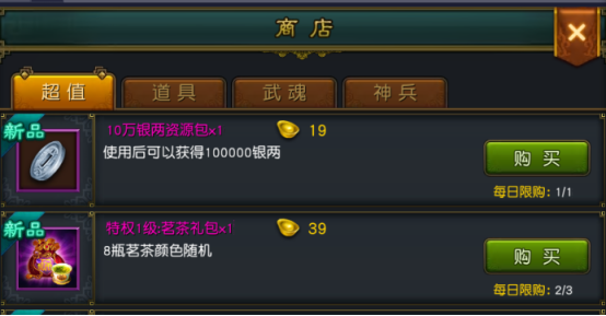 而我们平民玩家怎么办!那就是只斗免费茶,是紫色以上就斗。其他时间再也不品茶斗茶!这里我们就需要到商店购买特权一茗茶礼包更划算,如图。
