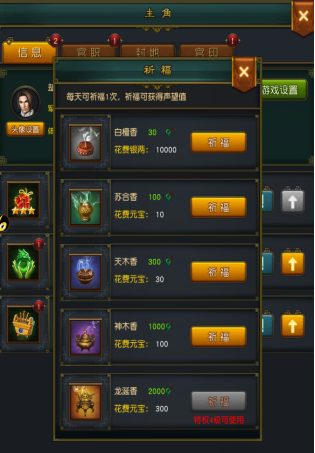 这里首先建议大家充值到特权四,每日祈福花费300元宝换取2000声望。