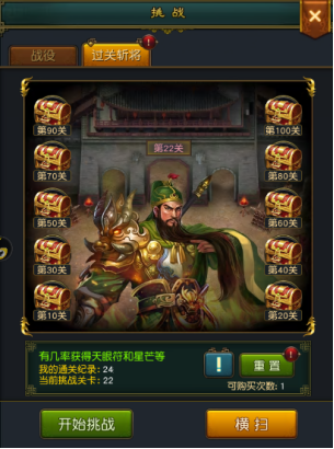 4.关卡重置后可重新从第一关开始挑战,每天可免费重置1次,也可花费元宝重置,特权等级越高购买重置次数越多。