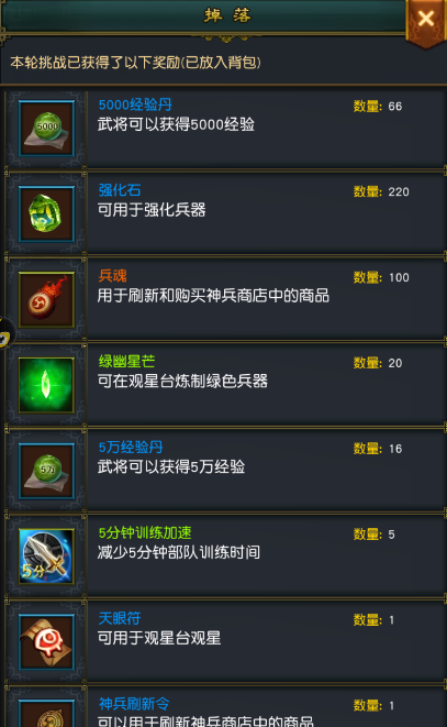 1.关卡共100关,挑战可获得兵器和兵器材料,每5关有几率获得珍贵的神兵部件等奖励。