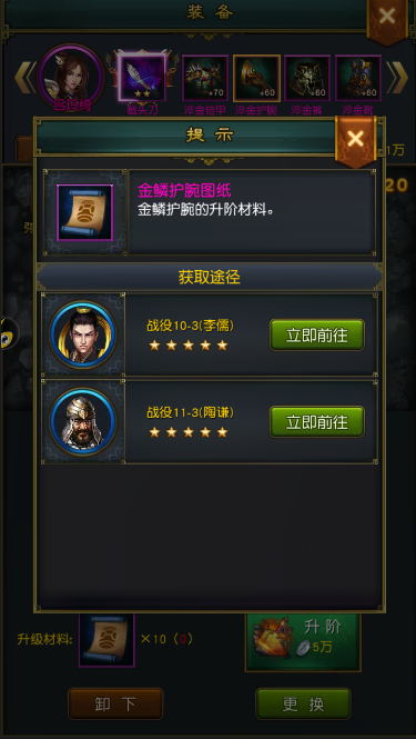 装备可以通过挑战-战役中获得,亦可直接从国力商城中直接购买;