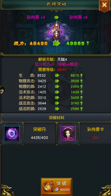 武将升到一定的等级可以消耗材料进行突破, 武将突破会解锁天赋,同时也会增加武将本身的各个属性,实战能力大大增强;