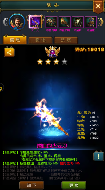 通过强化神兵可获得大量的属性加成,当神兵强化值满后可进行升星,升星可激活解锁新的特有属性;