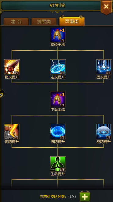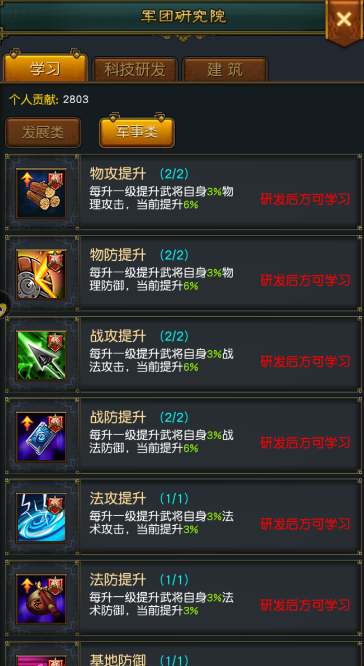 研究院的军事科技以及军团研究所的军事科技都直接影响武将自身属性,科技越高,武将属性提升越多;