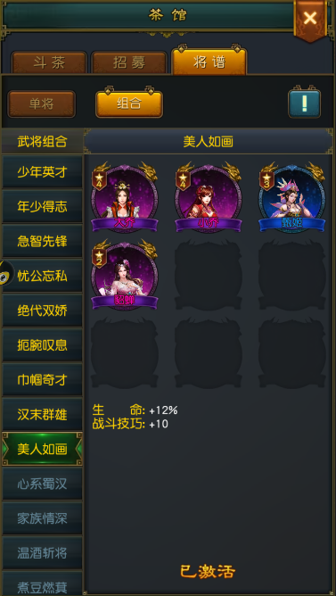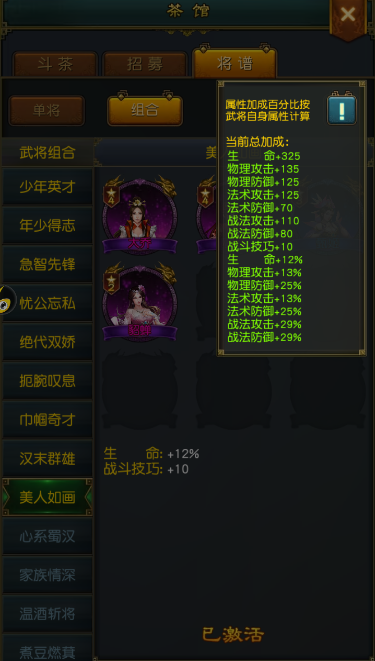 通过收集各种武将,可以激活武将组合的附加属性,该属性百分比直接加成到玩家所有武将属性之中;