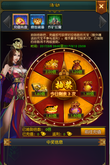 【活动内容】活动期间,在转盘中抽取返利倍数后,充值可获得对应倍数的元宝(额外赠送的元宝不参与返利)。每日可抽取3次,已抽到的倍数将不再被抽到。