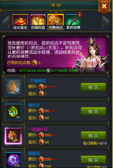 累计消费500元宝:强化石*60,神兵刷新令*15、折扣点*60