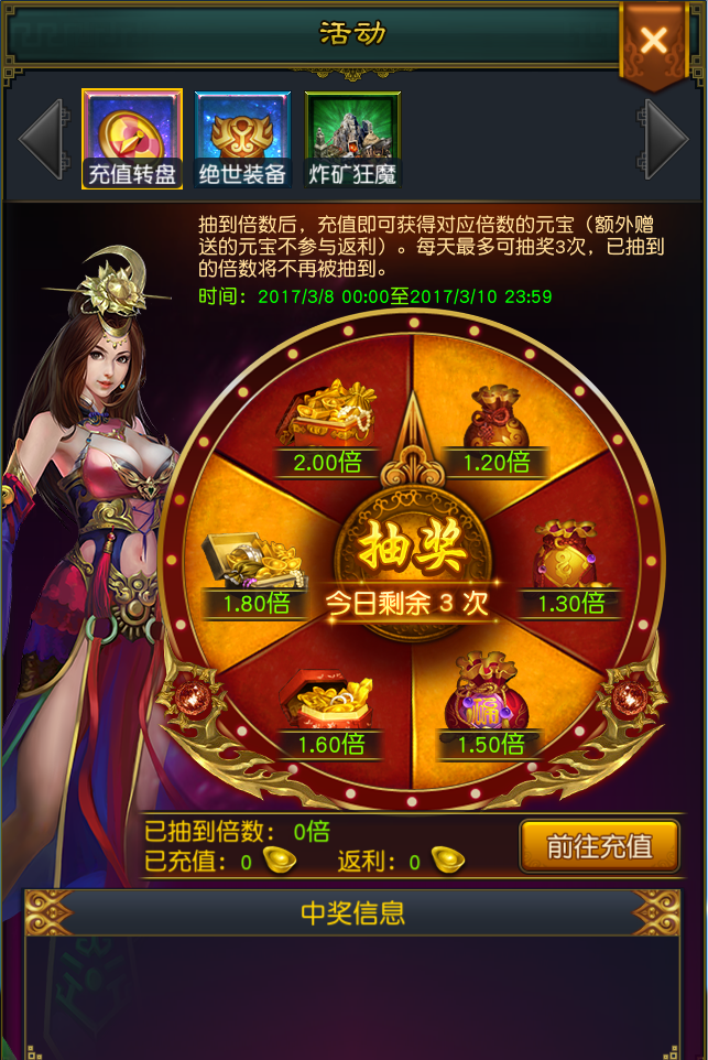 【活动内容】活动期间,在转盘中抽取返利倍数后,充值可获得对应倍数的元宝(额外赠送的元宝不参与返利)。每日可抽取3次,已抽到的倍数将不再被抽到。