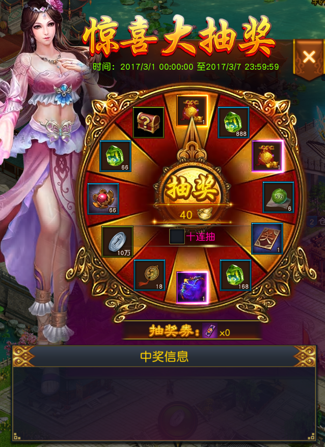 【活动内容】活动期间可以使用抽奖券或元宝在转盘中抽奖。有机会获得雌雄双剑部件包、紫色神兵包、神兵霸王枪等珍贵道具。