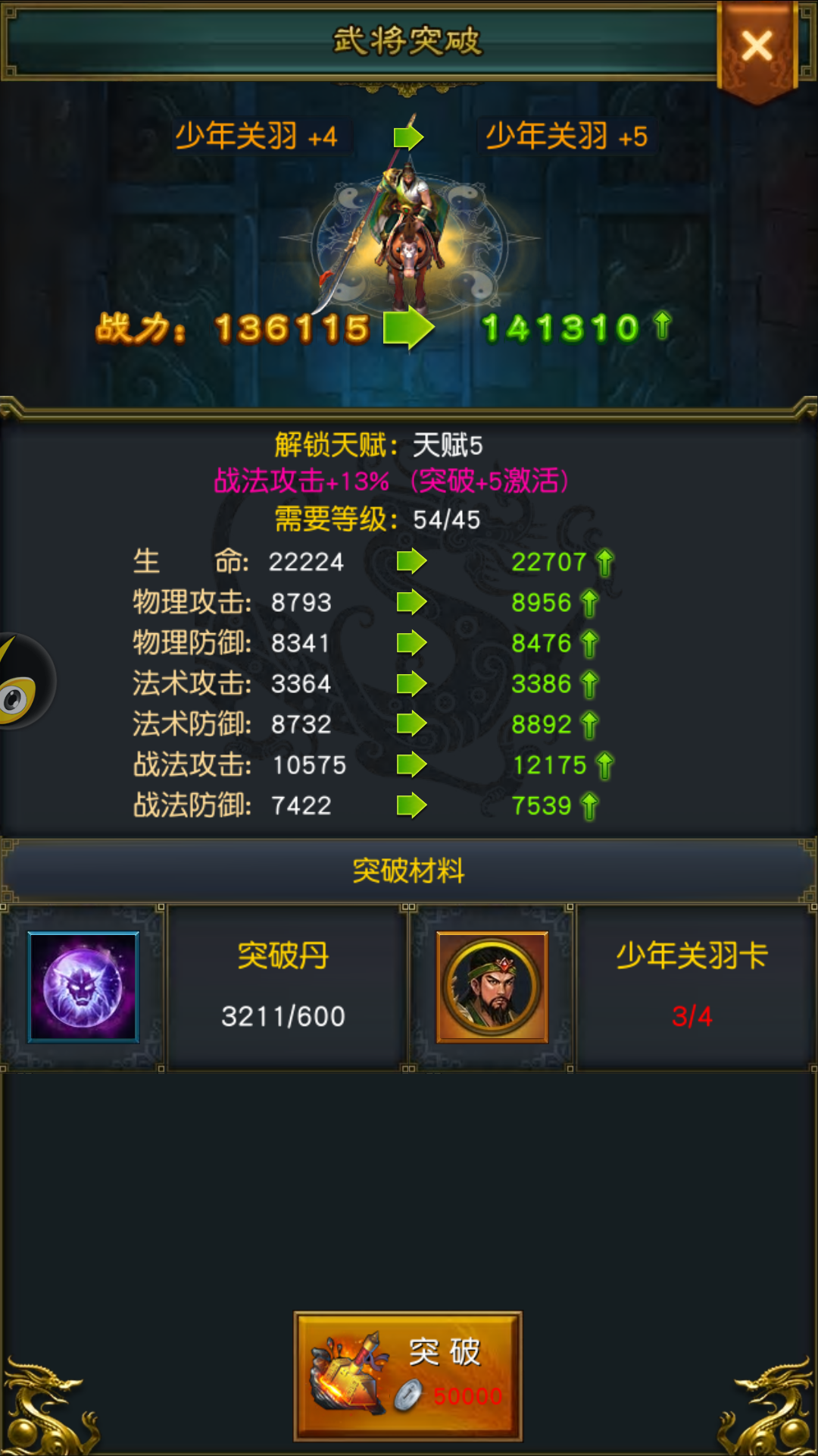 武将升到一定的等级可以消耗材料进行突破,武将突破会解锁天赋,同时也会增加武将本身的各个属性,实战能力大大增强;