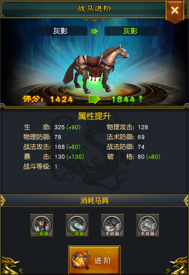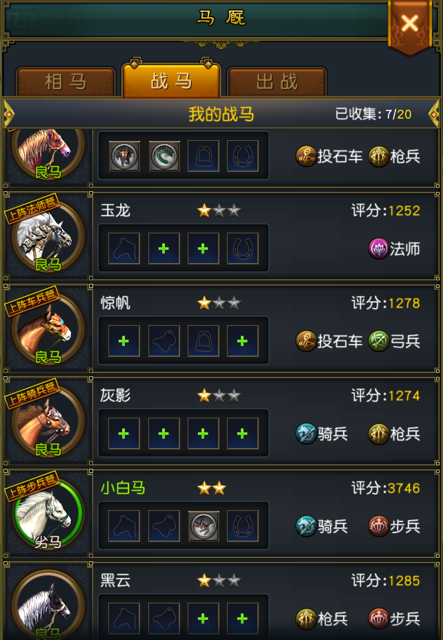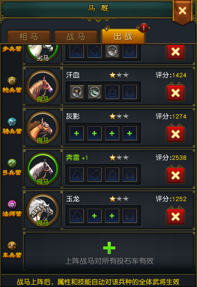 随着阶数提升,战马可用的装备品质也在提升,正所谓“好马配好鞍”,二者结合必能带来不小的收益。