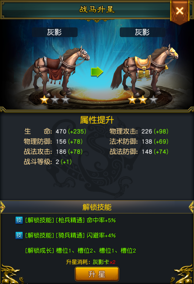 战马升星可以提升战马属性。
