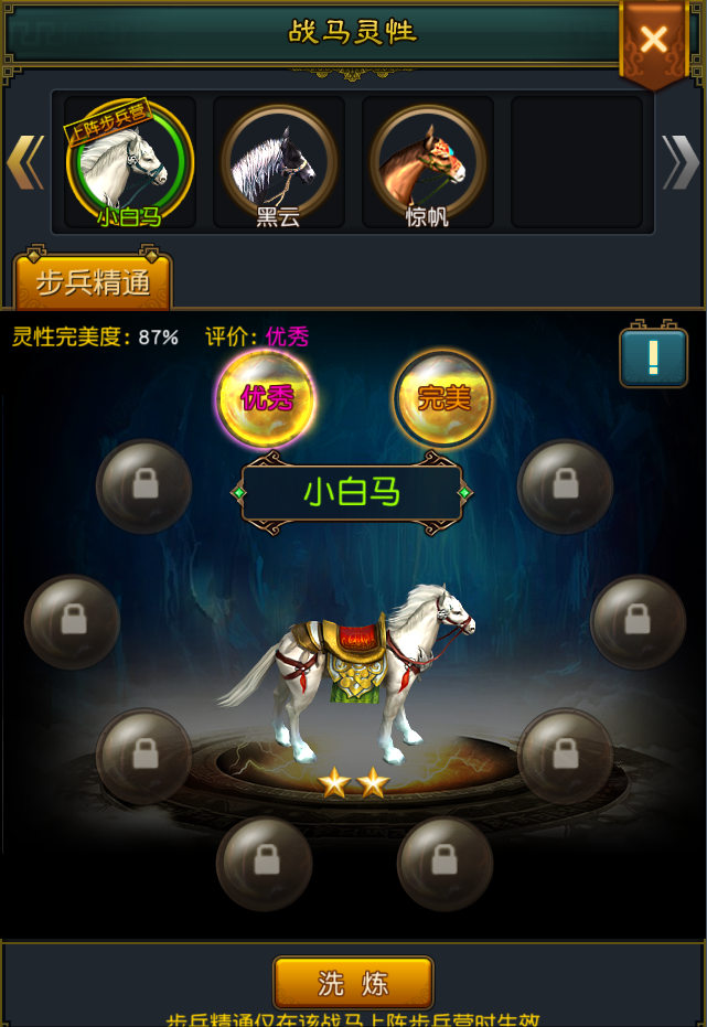 在战马详细介绍中的“成长洗练”一栏中,点击“成长”按钮,可以进入灵性洗练界面。