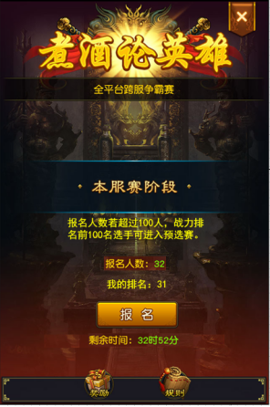 1. 服务器时间达到规定天数后,会开放“煮酒论英雄”玩法,官职达到规定级别的玩家均可报名参赛