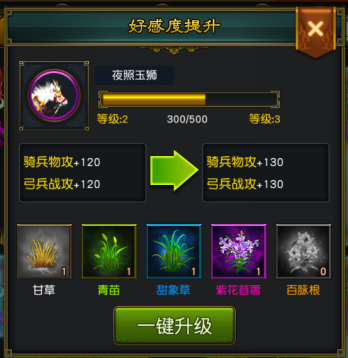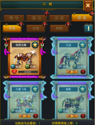 系统入口:马厩—图鉴 开启条件:六品一星 一、图鉴激活 1.战马图鉴会显示所有可获得的战马,未获得某战马时,其所对应的战马图鉴处于未激活状态,底部会显示战马碎片的收集进度; 2.获得战马后,可激活该战马的图鉴,激活后可获得对应的属性提升; 3.已激活的战马可提升好感度;