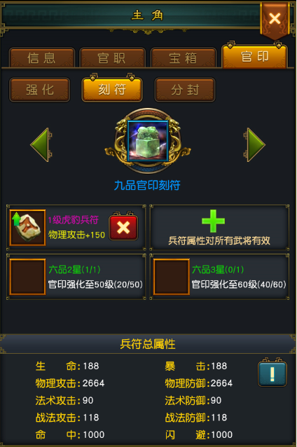 4丶每类兵符分为8级,等级越高,所增加属性越多;