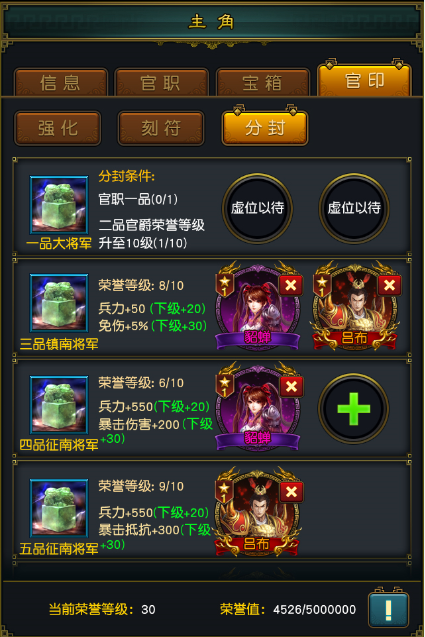 1丶官职八品后,荣誉达到规定条件后,可对武将进行爵位分封;