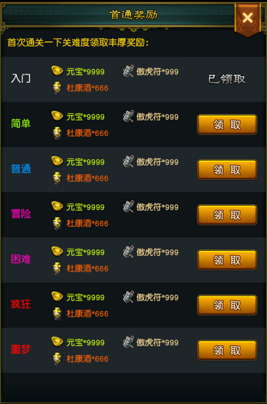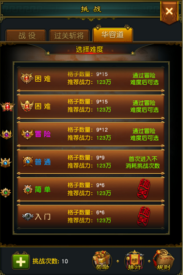 3、玩家可以选择进入所有已通关的难度以及更高一级未通关的难度;