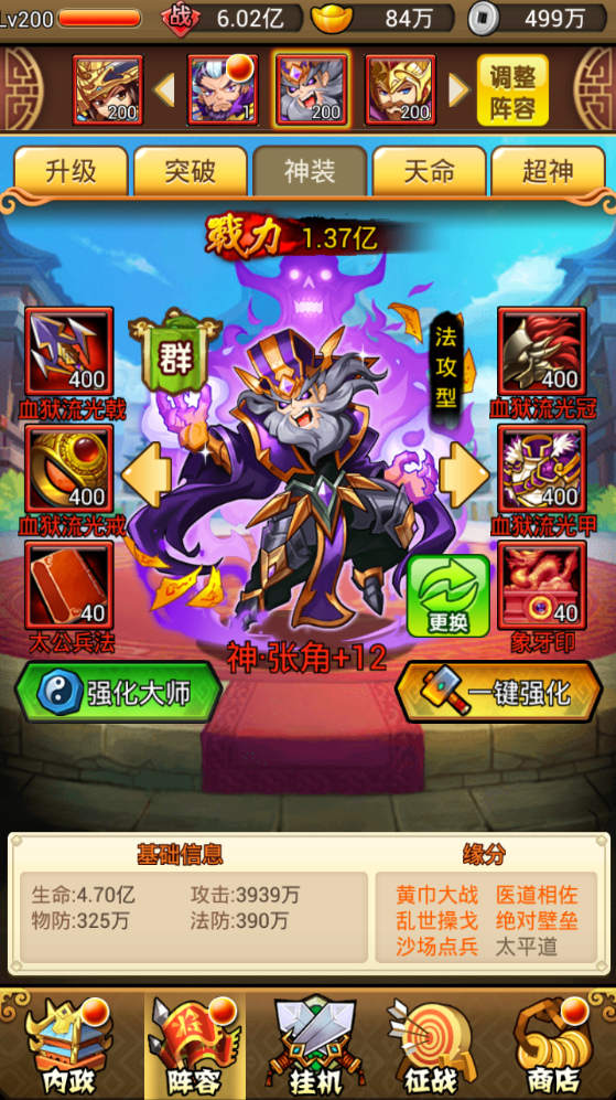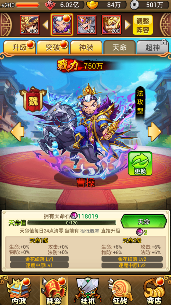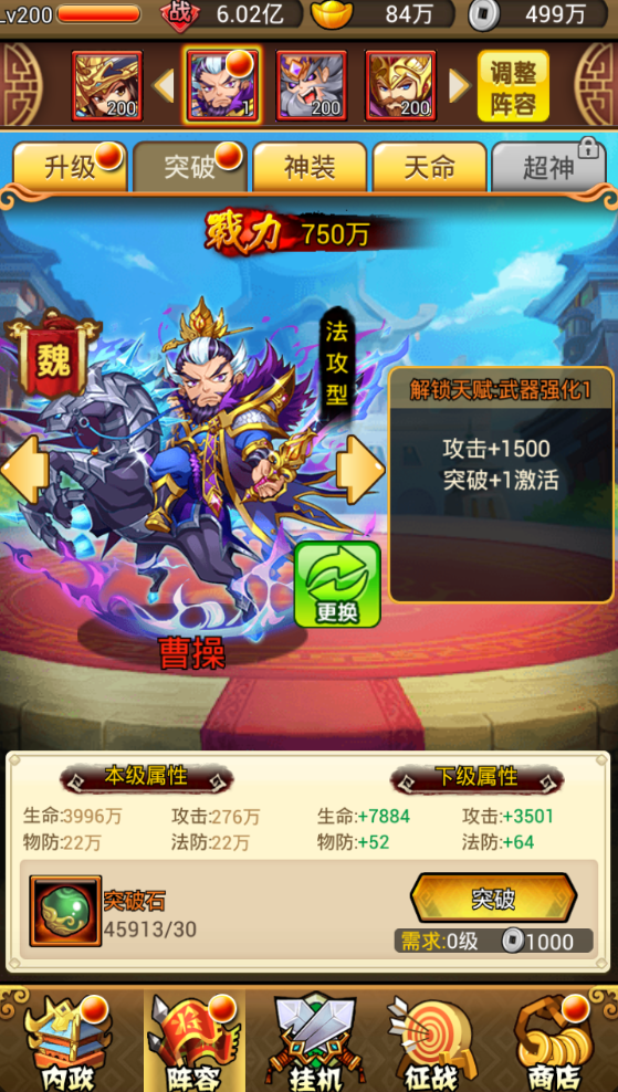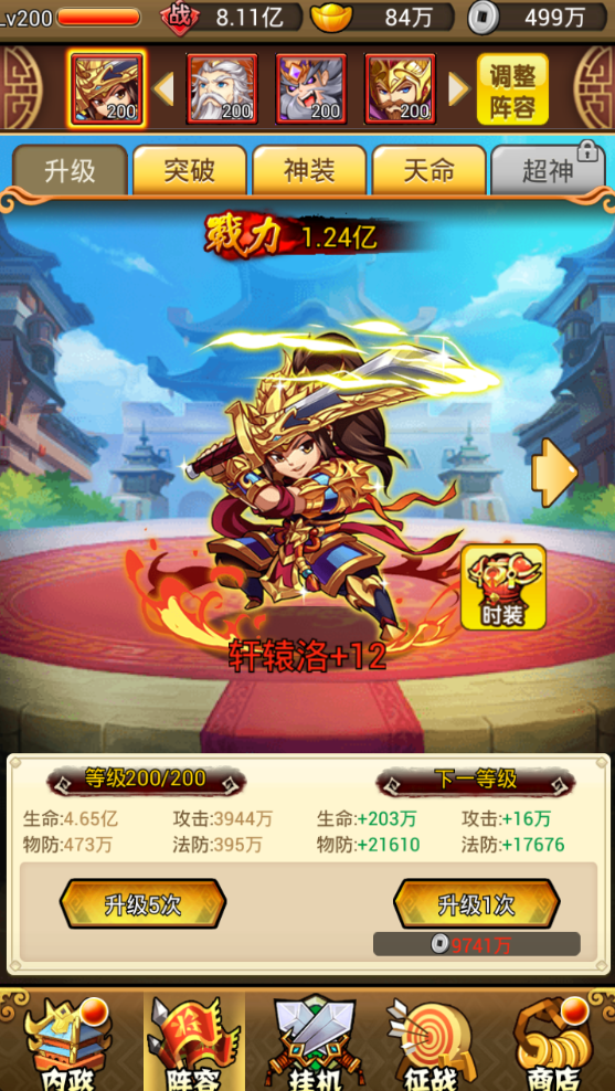 武将养成包含武将升级,武将突破,和武将天命,当然,武将是可以穿戴神装和宝物的,而且,主角可以穿戴并养成时装。 武将升级:武将升级贯穿于武将的整个生命周期当中,但是武将的最高等级不可超过战队等级,所以当您武将等级小于战队等级且武将升级所需消耗银币足够的情况下,随时都可以来武将升级界面进行武将升级。
