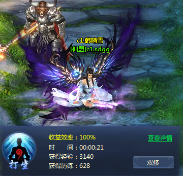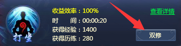 打怪下副本抢BOSS累了?可以随时随地打坐休息,回城打坐更可以享受1.5倍经验加成; 打坐可以持续每10秒获得经验和历练,等级越高经验历练越多。 普通打坐双修有2倍经验加成,回城双修会有3倍; 只要打坐以后,点击界面的双修按钮,就可以邀请对方双修。